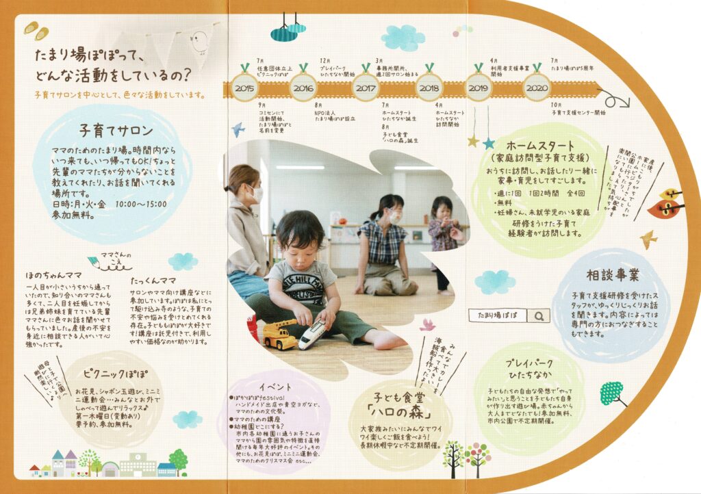 たまり場 ぽぽは,ママたちの交流の場です。 たまり場ぽぽを中心として,色々なイベントをしていきます。 子育て支援というと,小さな子どもという感じがしますが,ぽぽは子が大人として旅立つ日までを子育てと考え,関わっていきたいと思っています。